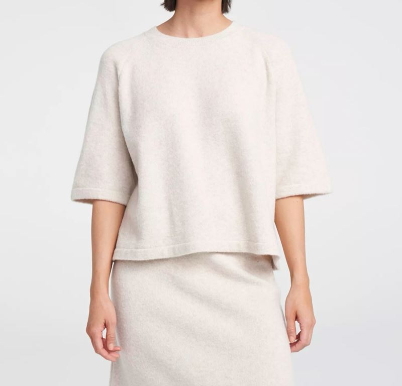 En mjuk stickad topp med avslappnad passform. Vida ärmar med längd till armbågen. 77% extra fin merino ull. 22% polyamide. 1% elastane. Handtvätt med milt tvättmedel.
